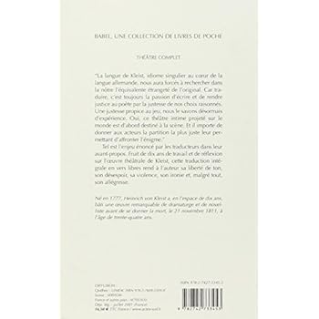 Pour ce qui est de cette édition, je rejoins les commentaires antérieurs, tant pour la qualité de la traduction que pour l'élégance et la finition du livre, tout en restant dans un prix abordable compte-tenu du nombre de pages.Quelques mots sur les ?uvres elles mêmes. Henrich von Kleist est un personnage fascinant, à la carrière littéraire courte - il s'est donné la mort à l'age de 34 ans - mais très riche. En France, on connaît particulièrement Le prince de Hombourg, un des rôles phares de Gérard Philipe, et La petit Catherine de Heilbronn. Son ?uvre théâtrale, et pas seulement elle, mérite que l'on fasse l'effort de la découvrir. PYB.